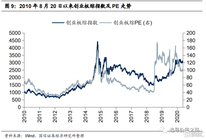 2016年之前,創業板市場指數漲跌主要受市場估值水平變動所主導,2016年後特別是2019年5月以來創業板市場向價值投資方向轉移。創業板綜指數從2010年8月20日的997點大幅上升至2015年底的3265點,漲幅達228%,期間創業板綜指數走勢與創業板綜PE具有高度的一致性,這表明當時估值水平對股指漲跌具有較大的貢獻。2016年以來,創業板綜指數漲跌與指數PE走勢出現了明顯的背離,這表明創業板市場指數上升主要是由市場股票盈利能力上升所牽引。