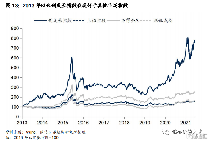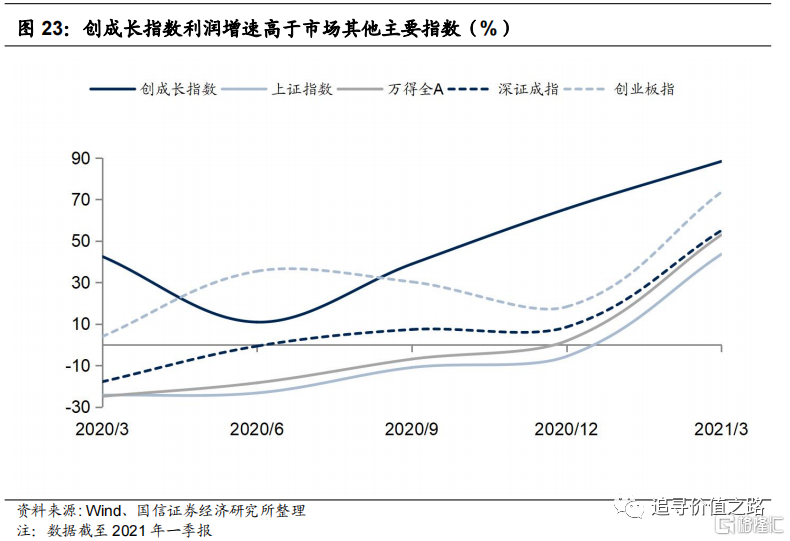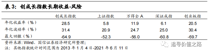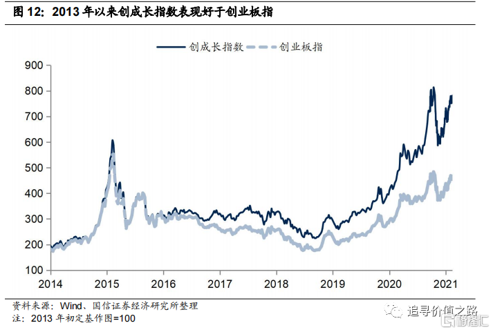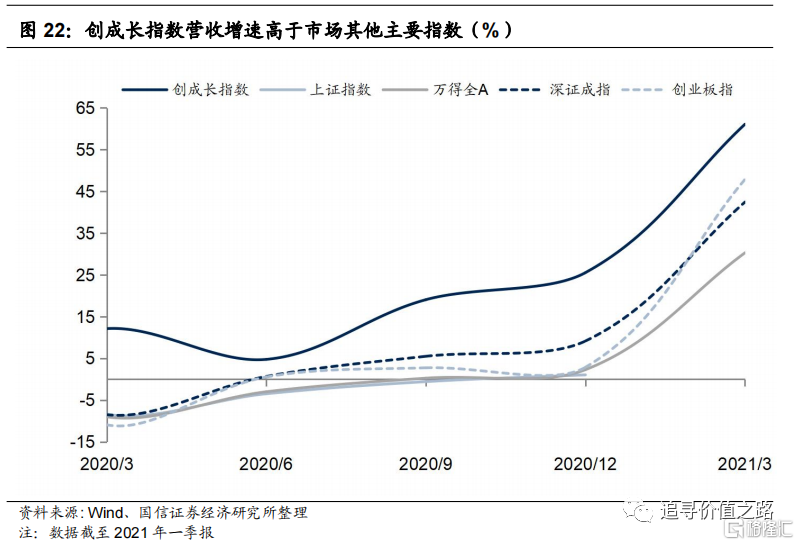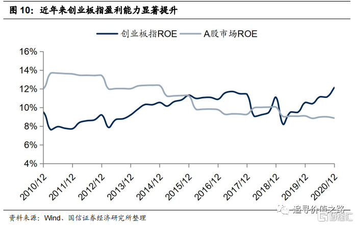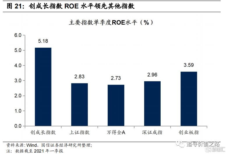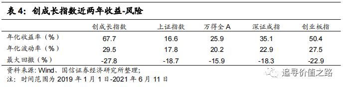創業板龍頭公司盈利成長性突出。近年來創業板股票盈利能力明顯增強並階段性超越市場整體表現。在低通脹和低利率的宏觀環境下,投資者在追逐高盈利性高增長性股票的同時,往往對高估值保持較強的容忍性,而業績較好的創業板此時投資價值更加凸顯。在當前證券市場註冊制改革背景下,創業板交易制度明顯優化,定位更為明確,業績好、成長性高的科技板塊將明顯受益。