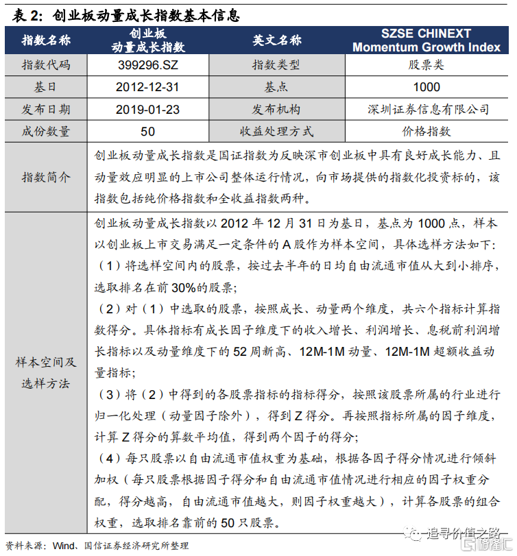 創業板動量成長指數是由深圳證券信息有限公司發佈的股票指數,反映創業板中具備良好成長能力、且動量效應明顯的上市公司整體運行情況,該指數從創業板中挑選具有良好成長能力和動量效應的50只股票組成樣本股。從歷史表現來看,2013年以來創成長指數收益顯著好於其他市場指數。創成長指數成分股市值的權重分佈以大市值、高技術的標的為主。行業分佈上,創成長指數權重主要分佈於醫療保健、工業、信息技術、金融等行業。當前創成長指數市盈率高於上證綜指、深證成指、Wind全A等市場指數,這表明在全球低利率背景下市場對於流動性好的高技術高成長的創成長類股票給予了一定的估值溢價。