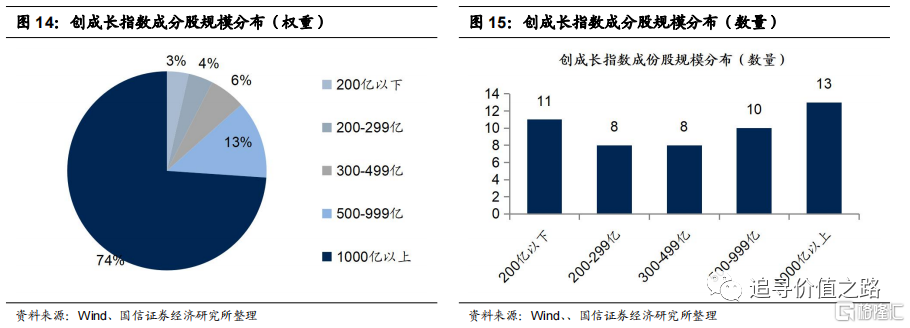 創成長指數成分股市值的權重分佈以大盤股為主,成分股市值的數量分佈較為均衡。截至2021年6月11日,創成長指數總市值1000億以上的成分股共13只,權重佔比為74%;總市值500億以上的成分股共23只,權重合計87%;自由流通市值不足300億的19只成分股權重共為7%。