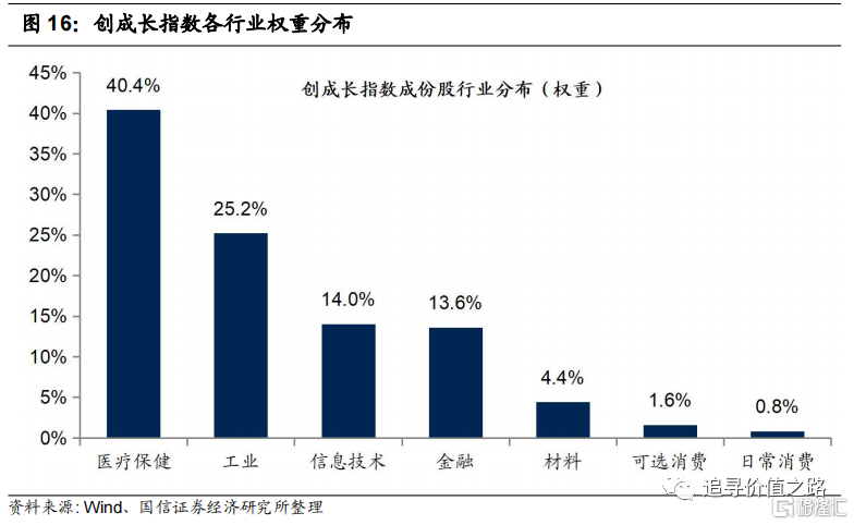 從wind一級行業的權重分佈上看,創成長指數成分股主要分佈於醫療保健、工業、信息技術、金融等行業。具體來看,創成長指數行業分佈相對較為分散,截至2021年6月11日,醫療保健和工業的權重佔比分別為40.4%和25.2%,信息技術和金融行業次之,佔比分別為14.0%和13.6%,而材料、可選消費和日常消費佔比均在5%以下。