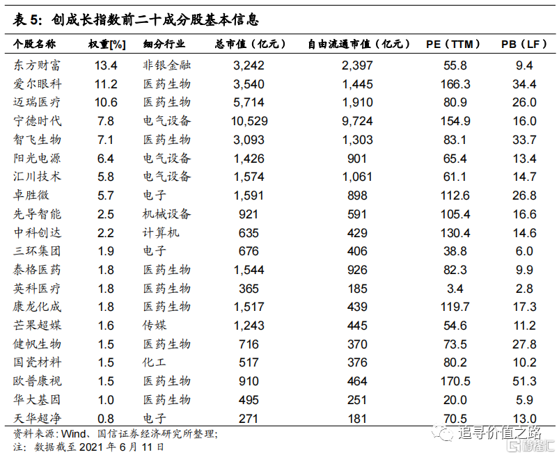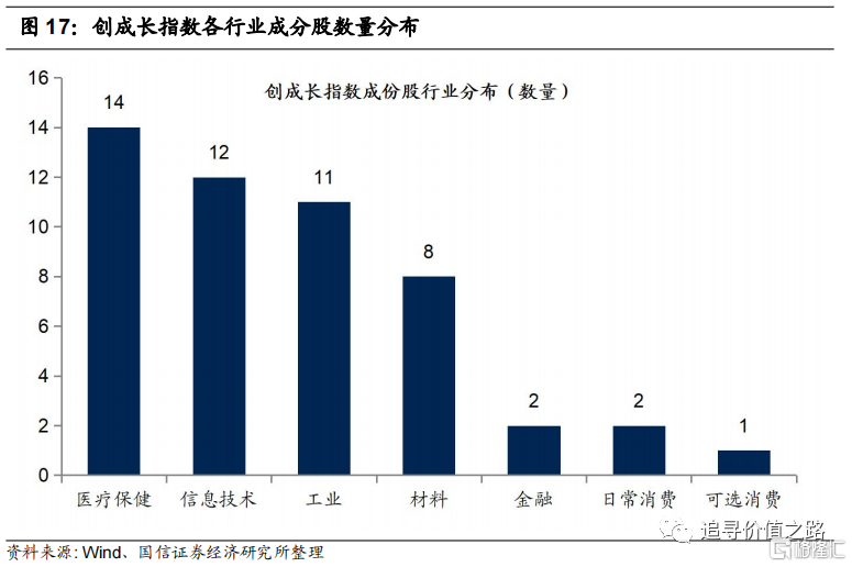 從wind一級行業的數量分佈上看,創成長指數成分股主要分佈於醫療保健、信息技術、工業等行業。具體來看,截至2021年6月11日,醫療保健、信息技術和工業三個行業成分股數量分別為14、12和11只,材料行業成分股數量為8只。而金融和日常消費行業成分股數量均為2只,可選消費行業成分股數量僅為1只。