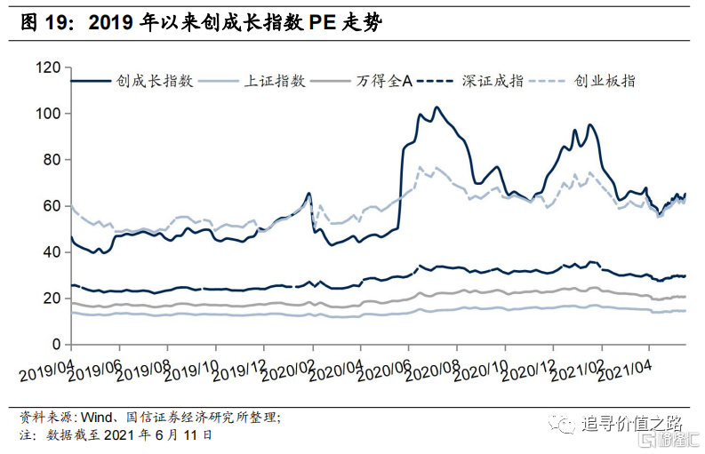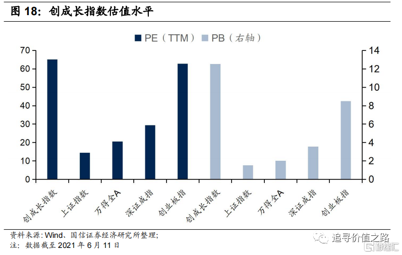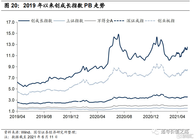 當前創成長指數市盈率高於上證指數、深證成指、wind全A、創業板指等市場指數,2020年中旬以來創成長指數的估值明顯抬升。從市盈率來看,截至2021年6月11日,創成長指數的PE(TTM)為65.2,高於我們選擇的幾個可比指數。就市盈率的歷史走勢來看,2020年6月以來創成長指數的估值震盪抬升,反映出了在全球低利率背景下市場對於優質高增長的高科技板塊給予了一定的估值溢價。