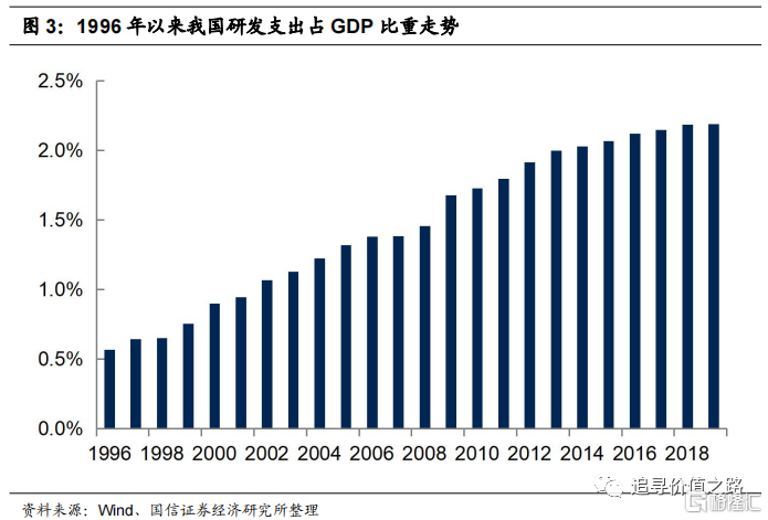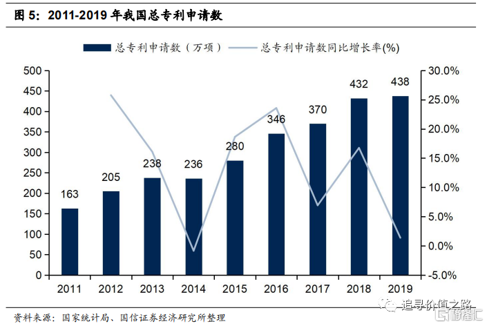 從專利申請數來看,我國科技創新熱情高漲,有望進一步助力我國創新型國家戰略的實現。根據國家統計局數據顯示,我國專利申請項從 2011年的163萬項增至2019年的438萬項,8年內增幅高達169%。在國際政治摩擦導致貿易受阻的背景下,2018年專利申請項同比上年增長16.8%,2019年總專利申請數同比增長率雖然有所下滑,但是總申請項數依舊在保持與前期最高水平基本持平的基礎上實現了小幅增長,這表明我國科研領域進一步持續發展,國內科技創新熱情高漲,與創新型國家戰略對基礎研究增長的要求相契合,基礎研究的增長有望進一步促成我國創新型國家戰略的實現。
