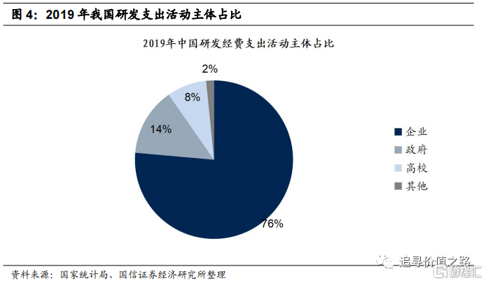 我國研發經費支出中企業佔比最大。2019年全國研究與試驗發展經費支出的主要支出主體為各類企業,佔比高達76.4%,企業研究與試驗發展經費支出共計16921.8億元,同比上年增長11.1%。政府下屬研究機構該項經費支出共計3080.8億元,佔比達到13.9%,同比增長14.5%。高等院校研發經費支出同比增長率最高,高達23.2%,2019年高校研發經費支出共計1796.6億元,佔比達到8.1%。