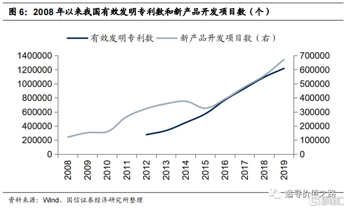 聚焦到有效發明和新產品來看,2008年以來我國有效發明專利和新產品開發項目數均有大幅提高。2012年以來,我國有效發明專利數量從277196個大幅提升至2019年的1218074個。新產品開發項目數由2008年的121359個大幅升至2019年的671799個。