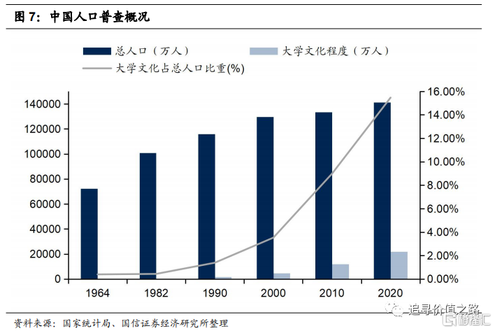 我國正在加速由“人口紅利”轉向“人才紅利”,有望為科技創新注入活力。根據全國人口普查數據,我國總人口由1964年的72307萬人增至141178萬人,增速逐漸放緩。與此同時,我國大學文化程度人口由1964年的287萬人增至2020年的21836萬人,大學文化人口占總人口比重由0.4%上升至15.5%,其中從2000年到2020年這20年間大學文化程度人口占比由3.5%上升至15.5%,上升了近12個百分點,大學文化程度人口淨增長達到17265萬人。高文化程度人口的增長會給科技創新的驅動注入新的活力,並且進一步推動我國科技創新的發展。