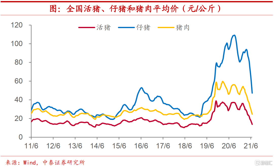 豬肉價格跌跌不休。今年春節過後,豬肉價格就從高位持續走低,活豬仔豬價格也是跌跌不休。據農業部數據,6月底豬肉全國平均價已從1月初的53/公斤降至不足25/公斤,價格近乎腰斬,同一時期活豬平均價從36/公斤降至不足14/公斤,仔豬平均價從87/公斤降至約47/公斤。