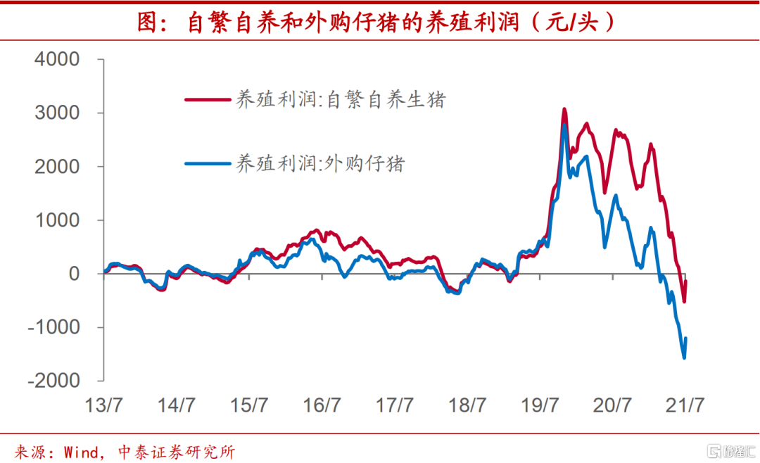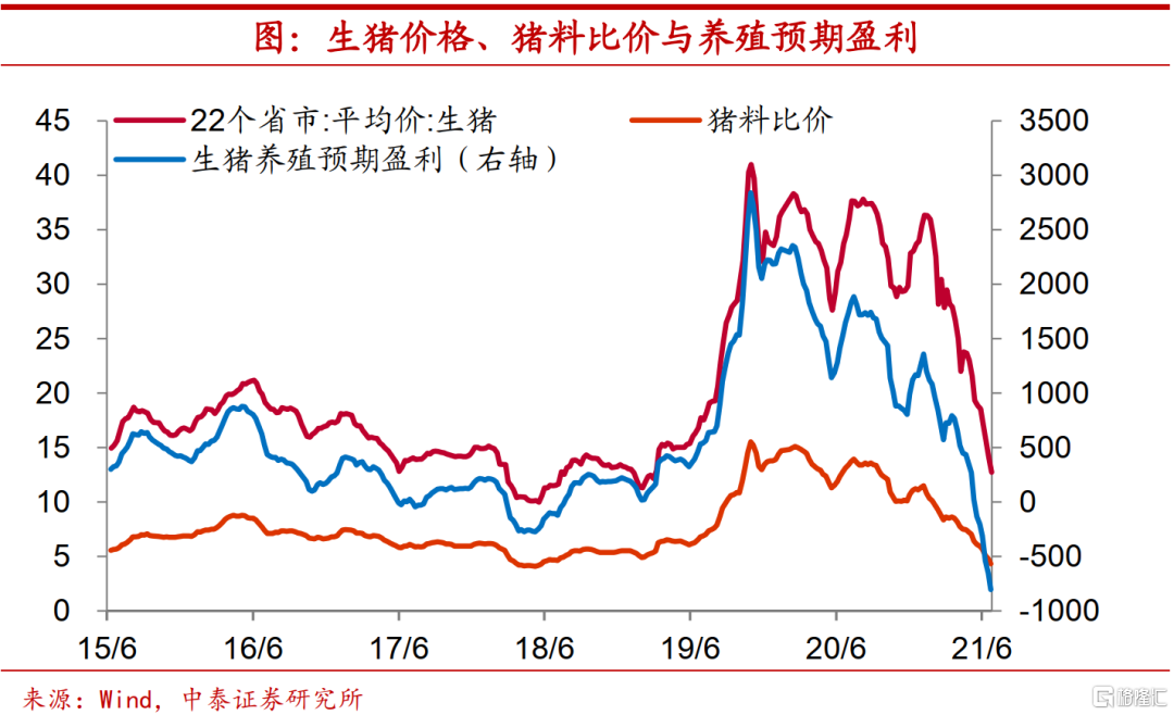 養殖利潤轉入虧損區間。最後,養殖利潤已轉入虧損區間。由於今年糧食價格的上漲,疊加豬價持續疲弱,5月中下旬豬糧比價已經降至6:1以下,顯著低於國家發改委所披露的生豬生產達到盈虧平衡點的豬糧比價。5月中下旬以來生豬養殖預期盈利已經轉入虧損區間,6月底預期虧損更是超過800/頭。而從歷史經驗上來看,生豬養殖預期盈利轉為虧損,通常不久後豬價就會止跌回升。