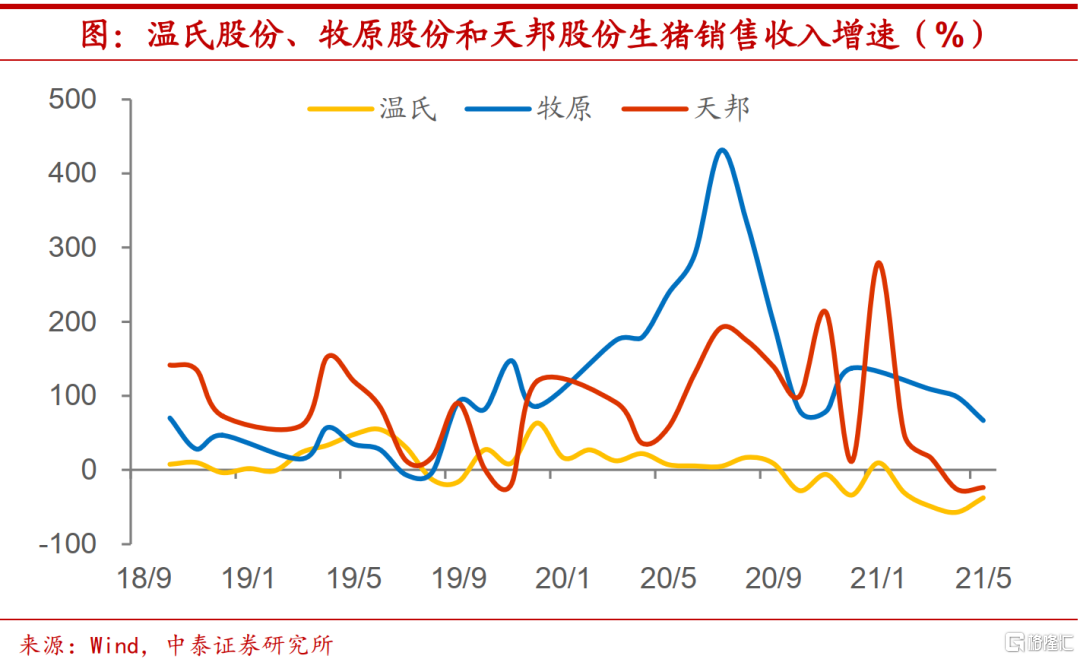 龍頭企業收入增速走低。即便行業內的龍頭企業,銷售收入也步入了低增速乃至負增速階段。在去年高基數效應的影響下,今年以來温氏股份、牧原股份和天邦股份生豬銷售收入增速持續走低,其中温氏股份和天邦股份生豬銷售收入已轉入負增長。