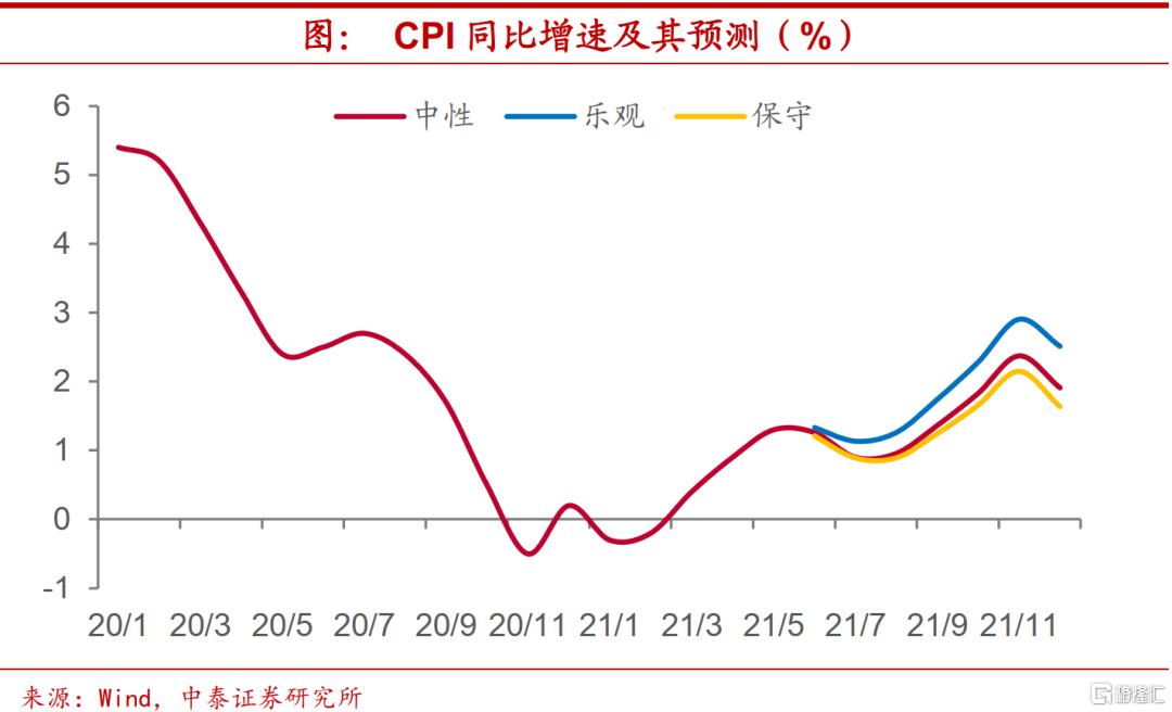 下半年CPI走勢前低後高,高點較難突破3%。基於對豬肉價格不同的情景假設,我們對年內CPI同比增速走勢做以預判。在中性情形下,下半年CPI同比增速呈現前低後高的態勢,高點或將突破2%,而全年增速中樞約在1.1%左右。而在豬肉價格出現顯著上行的樂觀假設下,下半年CPI同比增速高點或將接近3%,但全年增速中樞受到上半年低迷走勢的拖累,整體變化不大,不會超過1.5%。