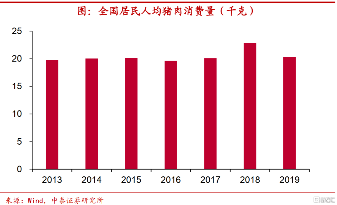 需求相對平緩。由於消費習慣基本穩定,因而居民對於豬肉需求的變化相對較為平緩,僅隨季節改變表現出較大波動。2013年以來我國居民人均豬肉年消費量大體維持在每年20千克左右的水平,呈現平穩態勢。