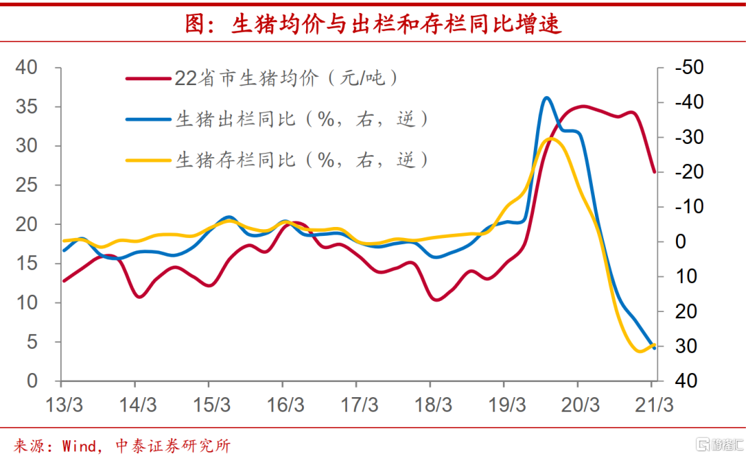 供給尤為充裕,拖累豬價走低。隨着疫情等因素對供給端制約的逐漸消除,生豬出欄和存欄同比增速持續走高,反映出供給較為旺盛。自去年三季度以來,生豬出欄同比增速就維持在15%以上,今年1季度生豬存欄同比增速也維持在30%左右的高位。而春節消費旺季已過,供給相對需求較為充裕使得豬價跌勢不止。