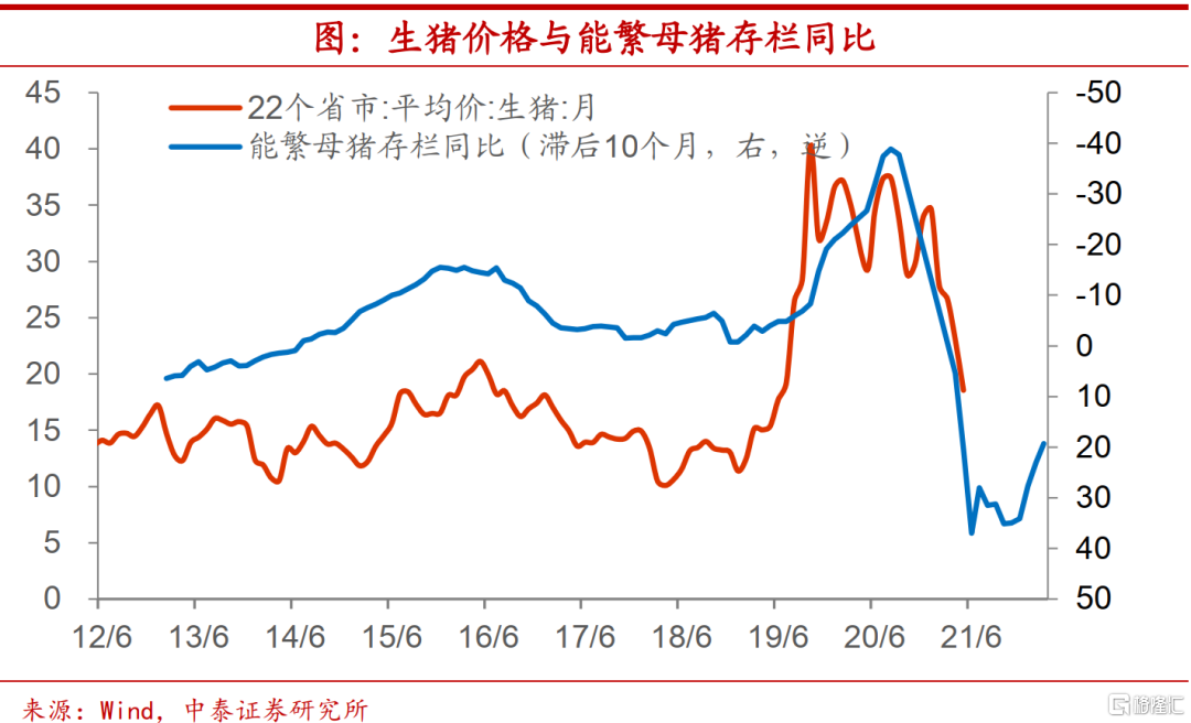 能繁母豬存欄增速回落。首先,能繁母豬存欄同比增速有所回落。由於生豬養殖週期的特點,一般來説,能繁母豬存欄同比增速會領先於豬價變化,領先週期約為10個月左右。去年下半年以來,能繁母豬存欄量同比增速轉正,對應到今年上半年豬肉價格的低迷,而按照這一領先性來看,今年下半年前期母豬存欄對於供給增加的壓力邊際上有所減輕,豬價跌勢有望緩解。
