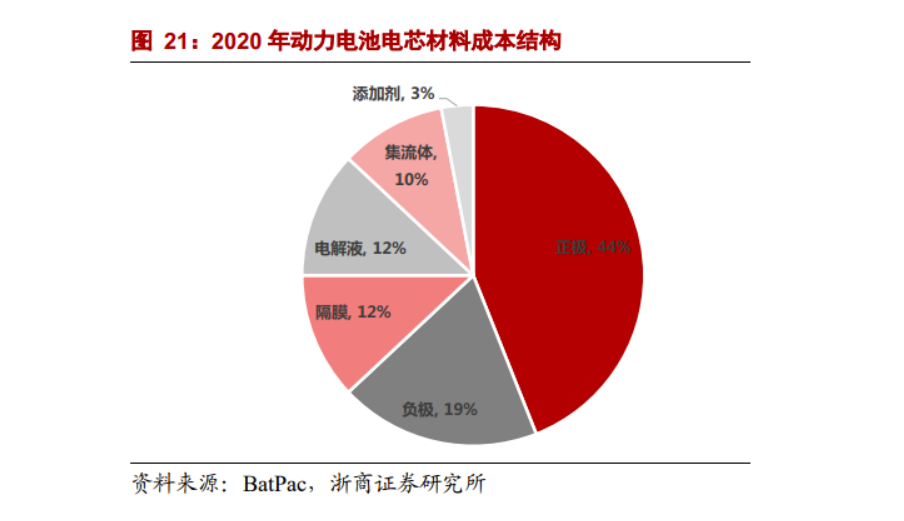 動力鋰電池材料包括正極、負極、隔膜和電解液,成本佔比分別爲44%、19%、12%、12%左右。