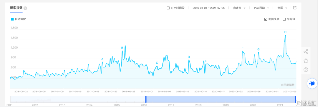 從百度指數來看,“自動駕駛”在2018年達到高位,2019年在起起伏伏中回落,並在今年再次來到歷史高點。