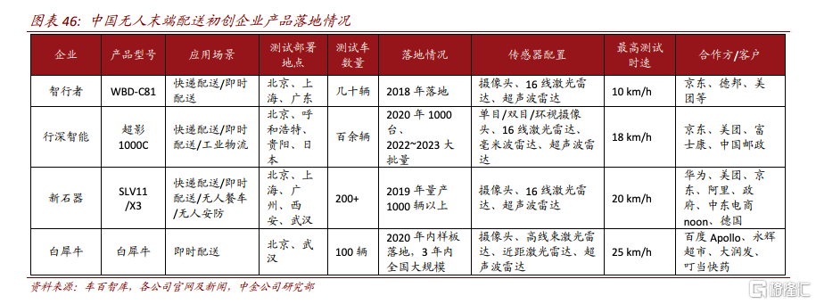 第二類是從自動駕駛技術切入特定場景的初創公司,期望在低速載物場景實現自動駕駛技術的商業化,比如白犀牛聯合永輝超市推出零售無人配送,行深智能在江漢大學、蘇州高鐵新城推出無人配送和無人零售等。
