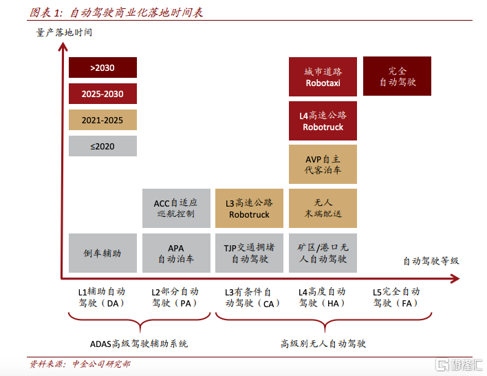 根據中金公司的測算,L4 級無人Robotruck/Robotaxi直到2025-2030年才開始商業化落地,而L3級高速公路有條件自動駕駛、L4級自主代客泊車、礦區自動駕駛和無人末端配送等場景將在2025年前量產落地。