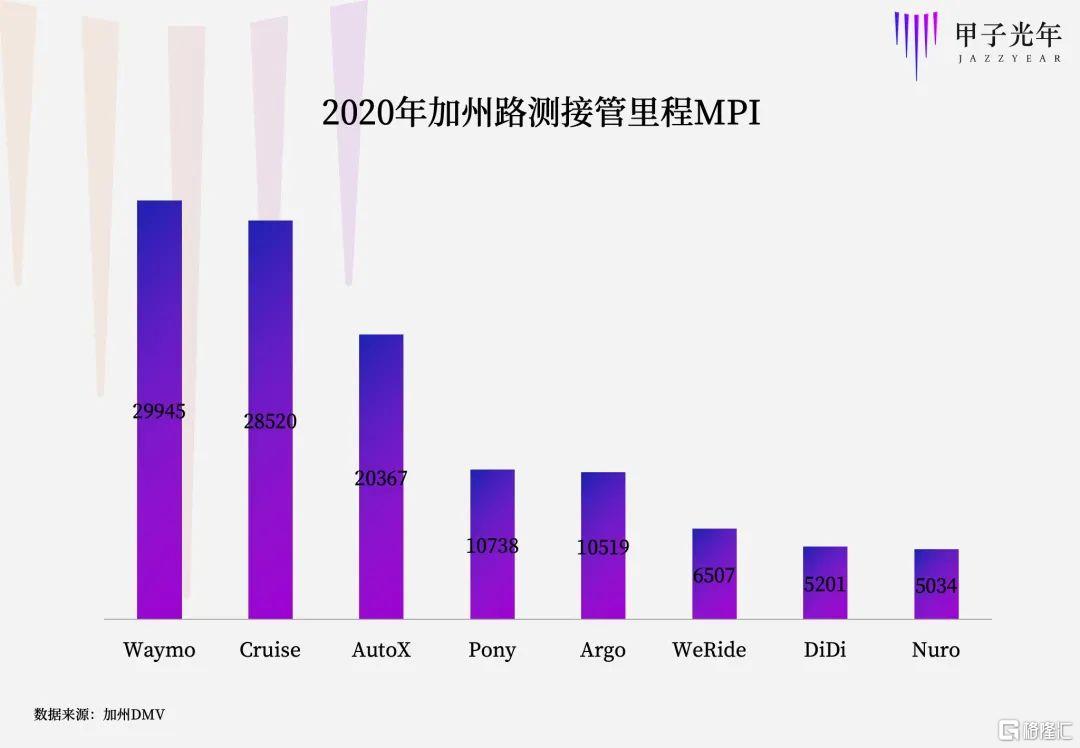 如何評判每家自動駕駛企業的技術高低?根據2020年加州車管所的MPI(Miles Per Intervention,每兩次人工干預之間行駛的平均里程數)排名顯示如下: