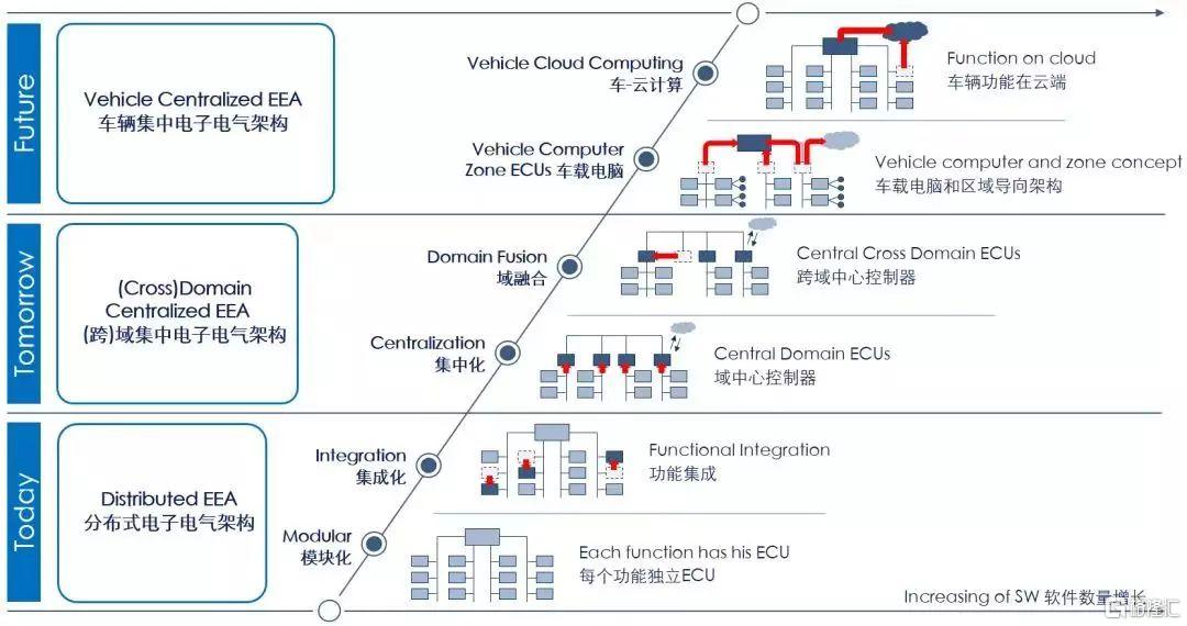 而現在,電動汽車用電池、電機、電控系統重構了“汽車”這個概念,汽車變成了裝着輪子的電池加底盤。傳統的分佈式電子電氣架構正在快速轉變,過去幾十上百個分散式的ECU驟減為3~5個“域控制器”。