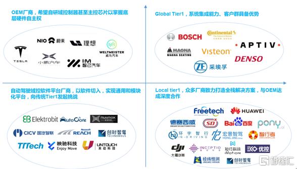 佐思智研將自動駕駛域控制器的玩家分為四類:Global Tier1、Local Tier1、自動駕駛域控軟件平台廠商、以及OEM廠商。
