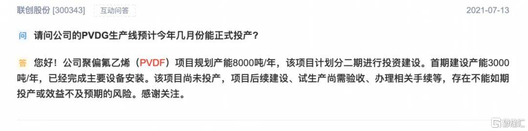 7月13日,聯創股份在投資者互動平台表示,PVDF項目規劃產能8000噸/年,該項目計劃分二期進行投資建設。首期建設產能3000噸/年,已經完成主要設備安裝。該項目尚未投產,項目後續建設、試生產尚需驗收、辦理相關手續等,存在不能如期投產或效益不及預期的風險。