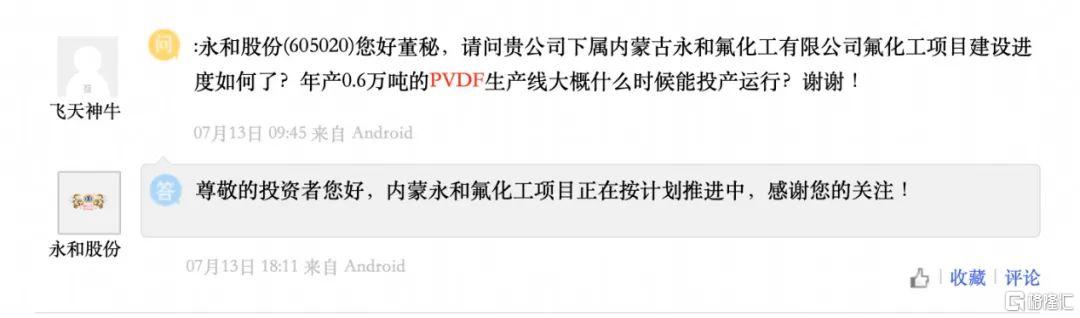 7月9日,永和股份登陸滬市主板,公司擁有從上游螢石礦資源到下游高分子氟化工品的完整產業鏈。近日,有投資者在互動平台向公司提問:“請問貴公司下屬內蒙古永和氟化工項目建設進度如何?年產0.6萬噸PVDF生產線大概什麼時候能投產運行?”公司表示,內蒙古永和氟化工項目正在按計劃推進中。