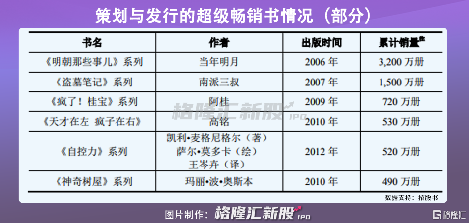 磨鐵文化的主要優勢產品是文學類和社科類圖書,報告期內,佔圖書策劃與發行收入的比例均超八成。截至2020年末,排名前三的暢銷書——《明朝那些事兒》系列、《盜墓筆記》系列、《瘋了!桂寶》系列的累計銷量分別爲3200萬冊、1500萬冊、720萬冊,爲其業務增長帶來一定的穩定保證。