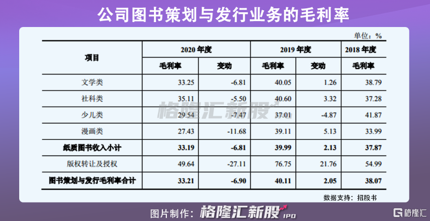 不過,報告期內,磨鐵集團圖書策劃與發行業務的毛利率分別爲38.07%、40.11%、33.21%,低於同行業可比公司的平均值,主要受圖書銷售實洋、商業折讓、紙張成本、版權成本等因素所致。