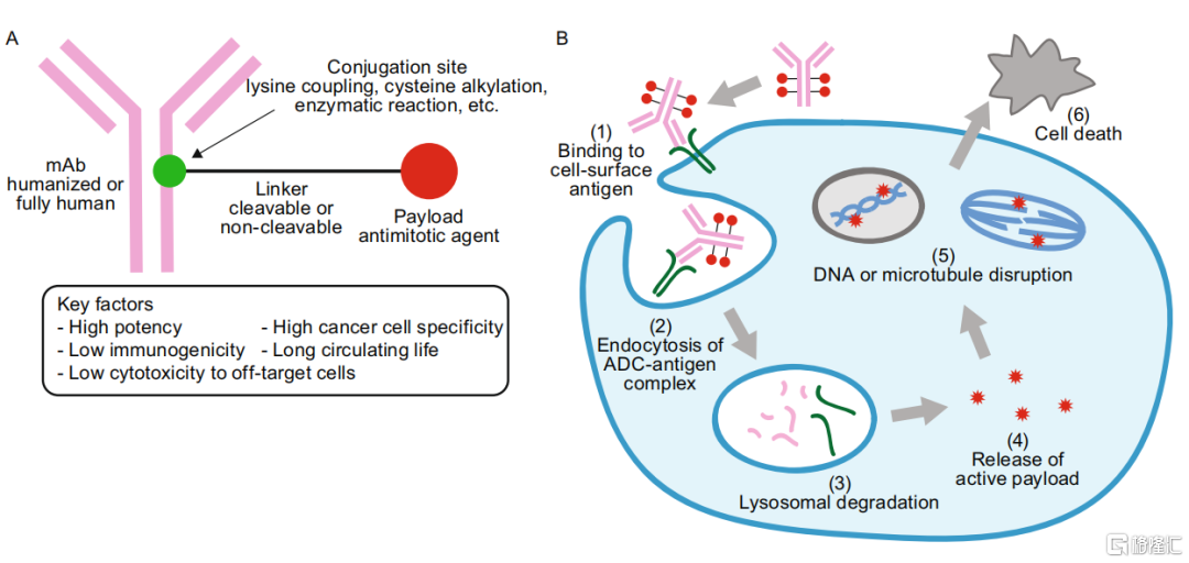 ADC由抗體、細胞毒藥物、連接子三部分組成。理想狀態下,當ADC進入體內循環系統後,抗體識別腫瘤細胞表面的抗原表位並與之結合,腫瘤細胞將ADC吞噬,之後在細胞內被溶酶體降解,細胞毒藥物釋放從而殺死腫瘤細胞。如果將抗體偶聯藥物比作核導彈,那麼抗體就相當於導彈,而細胞毒藥物就是核彈頭。