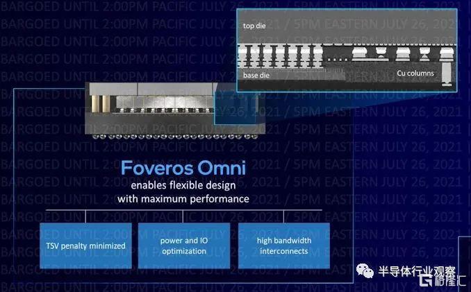 這意味着第一代 Foveros 需要top tie小於 base die的限制現在被取消。top tie可以比base die大,或者如果每個層上有多個裸片,它們可以連接到任意數量的其他硅片。Foveros Omni 的目標是真正解決 Foveros 初始部分中討論的功率問題——因為承載 TSV 的功率會在信號中造成大量局部干擾,因此放置它們的理想位置是在base die的外部。Foveros Omni 是一種技術,允許頂部裸片從基礎裸片懸垂,銅柱從基板一直延伸到頂部裸片以提供電源。