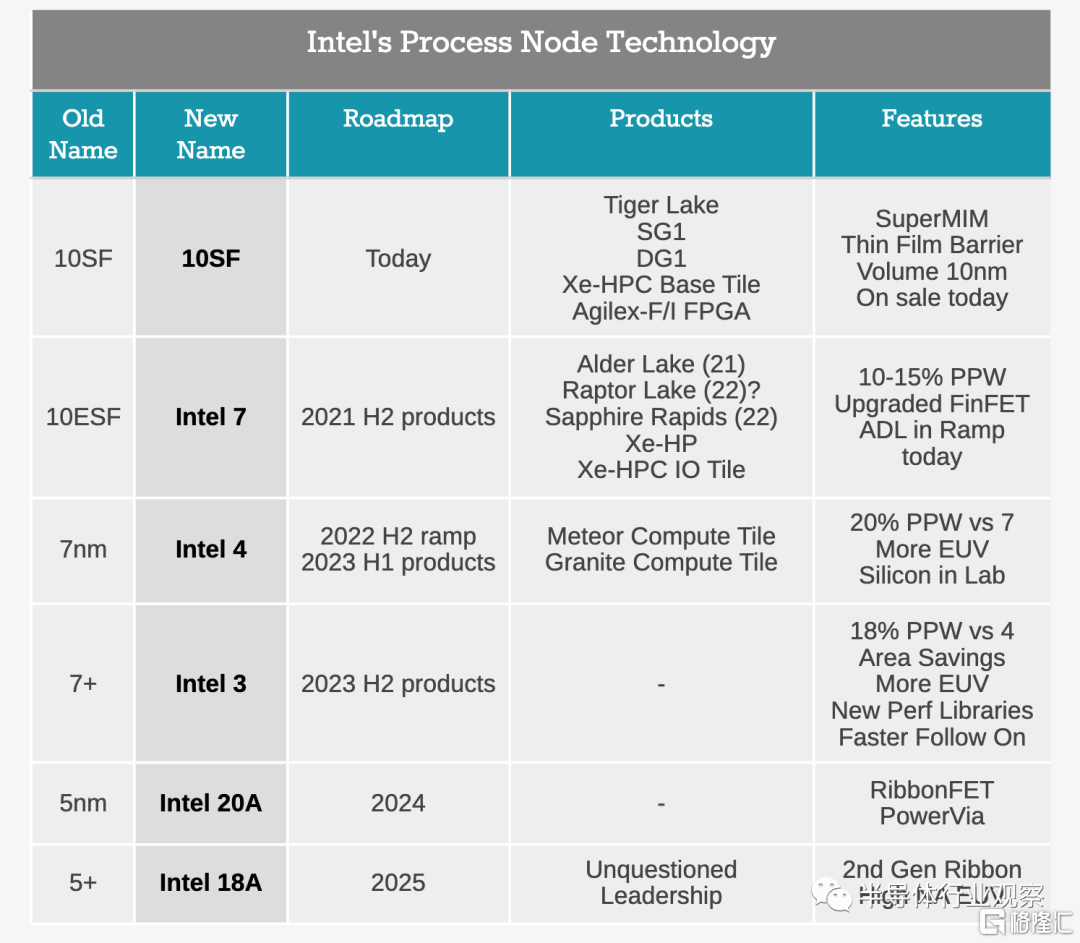 2021 H2,Intel 7:這個節點以前稱為 10nm Enhanced Super Fin 或 10ESF。Alder Lake (正在批量生產)和 Sapphire Rapids 都屬於這一代工藝的產品,由於晶體管優化,這代工藝的每瓦性能比 10SF 提高 10-15%。此外,英特爾的 Xe-HP 現在將被稱為英特爾 7 產品。