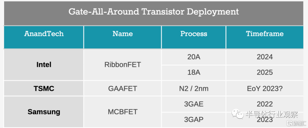 多年來,英特爾一直在半導體技術會議上討論 GAAFET,在 2020 年 6 月的國際 VLSI 會議上,時任Intel CTO的 Mike Mayberry 博士展示了一張圖表,其中包含轉向 GAA 設計的增強靜電。當時我們詢問了英特爾批量實施 GAA 的時間表,並被吿知預計“在 5 年內”。目前,英特爾的 RibbonFET 將採用 20A 工藝,根據上述路線圖,很可能在 2024 年底實現產品化。