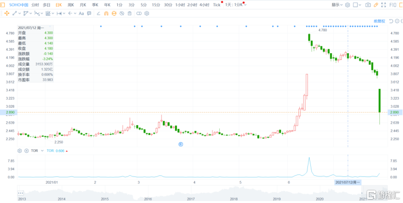 今日港股早盤,SOHO中國股價一度暴跌超30%,跌至2.9元/股。一個月前,SOHO中國股價大幅拉漲,半個月內股價幾近翻倍,而與6月17號的高點4.78元/股相比,如今股價已近腰斬。