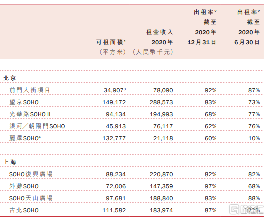 此外,截至2020年末,SOHO中國銀行存款和現金及現金等價物合計約4.65億元,同比下降68.2%。成熟投資物業的平均出租率僅恢復至82%;全年租金收入爲15.38億元,同比減少16.1%。核心寫字樓項目出租率在60%至97%之間不等,因疫情影響,成熟項目的出租率下滑至低位。由於數據過於難看,年報選擇了和中報數據對比。