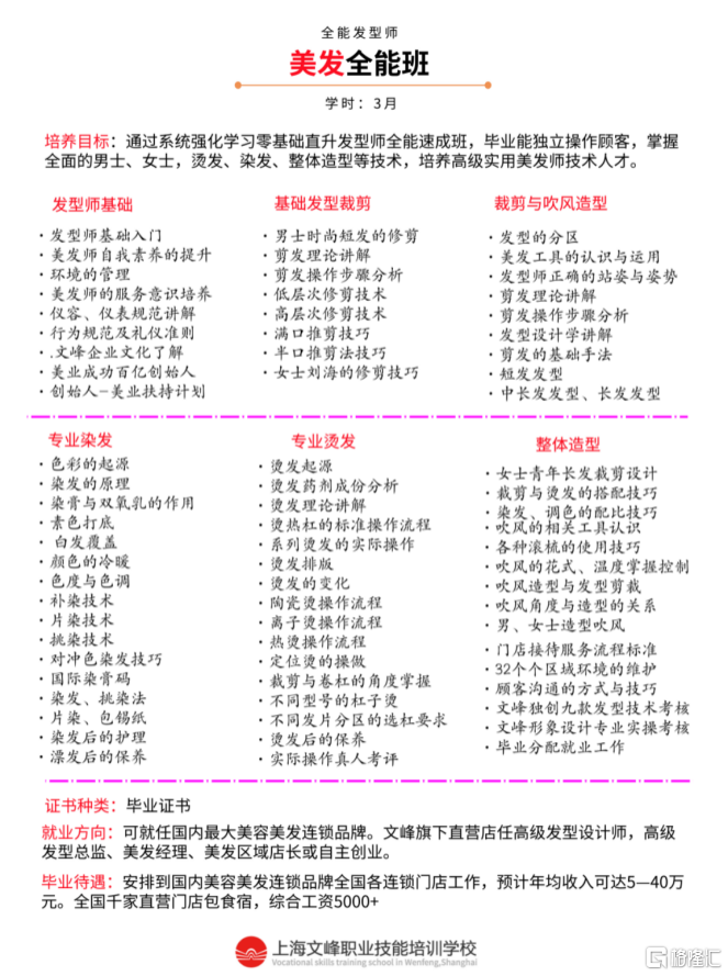 巧合的是,小巴從連鎖美髮品牌文峯,獲得了一張3個月的美髮培訓介紹單,學費價格是5950元。其中介紹了六大項技能,包括髮型師基本素質、基礎髮型裁剪、裁剪與吹風造型、專業染髮、專業燙髮、整體造型。畢業待遇一欄寫着:預計年收入5萬—40萬;包食宿,綜合工資5000+。