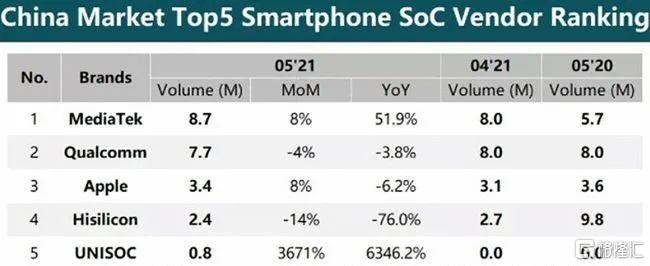 不過當前的情況是,聯發科衝擊高端還未成,又添了新的中低端市場勁敵:紫光展銳。根據CINNO Research發佈的《中國手機通信產業數據觀察報告》顯示,在今年5月中國智能手機芯片出貨量排名中,紫光展銳首次進入前五,同比增長6346.2%,主要是其獲得了榮耀、聯想等手機廠商的訂單;Digitimes Research還預測,今年紫光展銳的出貨量有望取代海思名列第三,僅次於高通和聯發科。