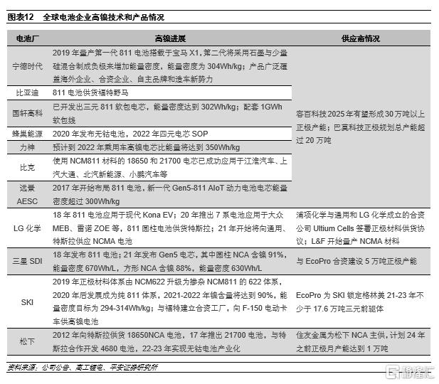 電池廠材料廠跟進,頭部企業率先受益。日本企業在高鎳方面佈局較早,松下主要採用NCA體系;國內寧德時代、比亞迪等頭部企業則採用NCM811路線;韓國企業相對多樣化,SKI以NCM為主並持續提升鎳含量,三星SDI研發NCA和NCM,LG化學則採取NCM和NCMA兩條路線。在較為關鍵的正極材料方面,中日韓企業都選擇先與本土的正極材料廠商合作,並且電池廠本身也具備一定的技術積累和量產能力,這也導致全球正極行業在短期內仍將維持相對分散的格局。