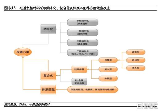 當前普遍採用的人造石墨/天然石墨材料能量密度已經接近理論上限372mAh/g,提升空間不大,理論上限能量密度達4200mAh/g 的硅材料產業化進程進入提速期。純硅作為負極材料時體積膨脹大,多次充放電會引起顆粒粉化、SEI膜重複生長消耗電解液,最終影響電池的循環穩定性,行業內一般採取納米化、複合化和體系匹配改進等改良方案。相比於晶體硅材料,氧化亞硅材料在嵌鋰過程中的體積膨脹大大減小,因此循環性能也得到了極大的提升,是目前行業內較為成熟的應用方案。