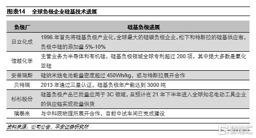 日韓技術較為領先,中國已實現量產。硅基負極材料於1996年由日立化成首次發明,目前技術較為領先的廠家多集中在日韓,包括日本日立化成、日本信越化學、韓國加德士、韓國大洲、美國安普瑞斯等。貝特瑞是國內最早量產硅基負極的企業,其他公司如杉杉股份也具備較強的技術積累和量產能力。