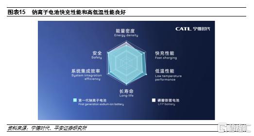鈉離子電池有望成為新能源領域補充的技術路線。鈉離子電池具有以下特性:1)能量密度弱於鋰電,強於鉛酸。鈉離子電池的電芯能量密度為100-150Wh/kg,遠高於鉛酸電池的30-50Wh/kg,與磷酸鐵鋰電池的120-200Wh/kg有重疊的範圍,與三元鋰200-300Wh/kg的水平有較大差距。僅從能量密度考慮,鈉電池有望首先替代低速電動車、儲能等市場,但較難應用於電動汽車和消費電子等領域。2)安全性高,高低温性能優異。鈉離子電池熱失控温度高於鋰電池,具備更高的安全性,高低温性能優於其他二次電池。3)倍率性能好,快充具備優勢。依賴於開放式3D結構,鈉離子電池具有較好的倍率性能,能夠適應響應型儲能和規模供電;在快充能力方面,鈉離子電池容量20%-80%的充電時間只需要10分鐘左右,快於鋰電池。4)資源豐富,材料成本較低。鈉資源地殼丰度是鋰資源的440倍,並且分佈相對廣泛;鈉離子電池不使用鋰、鈷等價格較昂貴的金屬,鈉鹽價格遠低於鋰鹽,負極集流體用鋁箔代替銅箔,材料成本具有較大優勢。