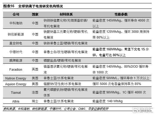 鈉離子電池產業化應用有望加速。2010年之後,由於大規模儲能市場的場景逐漸清晰以及產業界對未來鋰資源可能面臨供給瓶頸的擔憂,鈉離子電池重新進入人們的視野。之後十年時間,全球頂尖的國家實驗室和大學先後大力開展鈉離子電池的研發,部分企業也開始跟進。包括國際代表Faradion公司、國內代表機構中科海鈉和鈉創新能源以及鋰電池代表企業寧德時代等。近期寧德時代發佈旗下第一代鈉離子電池,電芯能量密度達到160Wh/kg,低温和快充性能優異,並計劃2023年形成基本的產業鏈。在鈉離子電池方面,國內企業和機構相比海外競爭對手有研發和專利方面的優勢。