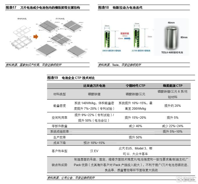 結構創新層出不窮,CTP和大電芯成為研發方向。除了材料本身的化學升級以外,通過做大電芯、做大模組尺寸乃至完全去除模組的物理變化也是主要方法之一。比亞迪刀片電池通過將單體電芯尺寸做大且在有限的空間內放置儘可能多的電芯單體、壓縮多餘連接件和結構件的數量的方式,提高整個電池包的容量、電壓、空間利用率,最終兼顧高體積能量密度、高安全性和低成本。寧德時代採用高電壓鎳55+大模組/CTP的方式將系統能量密度提升至超過180Wh/kg,同時降低成本,成為高鎳電池技術完全成熟之前的短期替代方案。LG化學已經完成了一種全新的"模塊包集成平台"的開發,可以在沒有模塊的情況下構建電池組,蜂巢能源推出了自己的CTP技術和產品,大眾也計劃研發和使用CTP和CTC技術。特斯拉計劃自產4680電芯,也是繼1865切換成為2170之後,電芯體系和容量的又一次提升,有利於提升能量密度,降低結構件成本。