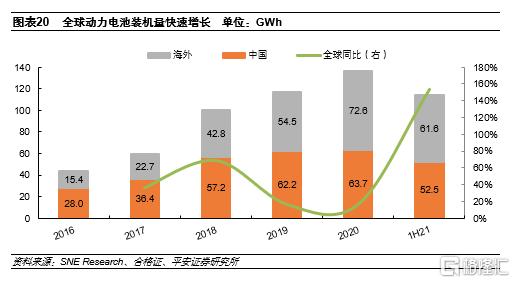 全球動力電池裝機量處於快速增長的階段。在全球新能源汽車滲透率持續提升的背景下,動力電池裝機量迎來快速增長。2016年全球動力電池裝機量僅為43GWh,2020年增長至136GWh,期間複合增速約33%。2019和2020年由於中國新能源汽車市場放緩導致動力電池需求增速較低,從2021年開始全球電動車市場共振帶來需求的強勢回暖,上半年裝機量達到114GWh,同比增長154%;預計2025年全球動力電池裝機量將超過1TWh。
