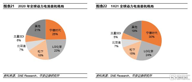中日韓瓜分全球市場。從2017年開始,寧德時代已經連續四年成為全球動力電池銷量冠軍,2020年市場份額達到25%,21年上半年進一步提升至30%。隨着歐洲市場的崛起,韓系廠商近年來增長迅速,LG化學市場份額已超過20%,全球動力電池市場呈現出“兩超多強”的格局。除了寧德和比亞迪之外,21年上半年中航鋰電、國軒高科、遠景AESC等國內企業也進入行業前十,5家中國企業的市場份額合計達到43.2%,而韓國3家合計佔比34.9%。