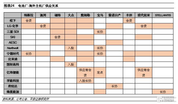 海外主機廠爭奪優質電池資源,國內二線廠商迎來發展良機。為保障大規模電動化計劃順利實施和供應鏈的安全穩定以及提升議價權,海外主流車企率先打破原有的單點或AB點的供應格局,逐漸向多點供應拓展,並通過合資、入股、簽訂長協等方式與國內的二線電池廠商進行更加深入的綁定。全球車企對優質資源的爭奪為二線電池廠商帶來了良好的發展機會,具備技術研發以及產能規模優勢的企業有望得到海外客户的認可和訂單機會,例如國軒和大眾、孚能和戴姆勒之間都有較深入的股權綁定關係;欣旺達、蜂巢能源、遠景AESC等企業也開始供貨海外主機廠。
