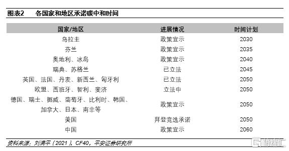 海外諸多國家也制定了碳中和時間表。2019年12月,新一屆歐盟委員會發布《歐洲綠色協議》(European Green Deal),明確2030年碳減排目標從40%提高到50%-55%,將2050年的80%-90%減排目標上調為碳中和;日本、韓國、美國等國家計劃在2050年實現碳中和。