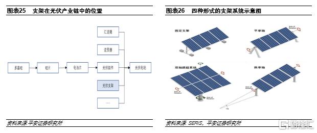 光伏支架可主要分為固定支架及跟蹤支架,固定支架主要包括最佳傾斜角固定式以及固定可調式,跟蹤支架主要包括平單軸、斜單軸和雙軸支架。相對固定支架,跟蹤支架能夠根據太陽位置,間歇驅動電機帶動機械機構,使光伏組件全天跟隨太陽位置運動,從而減小太陽光的入射角度,提高光伏組件對太陽能的吸收率。