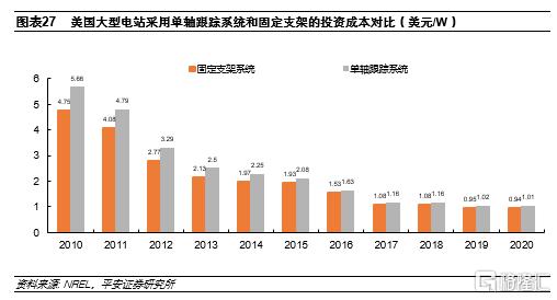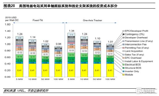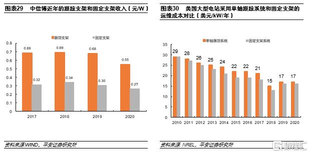 除了投資成本相對較高以外,後期的運費成本也相對略高;據統計,2020年美國100MW地面電站採用跟蹤系統的運維成本較固定支架系統高1美分/W。