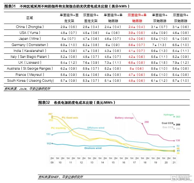 採用跟蹤支架雖然會增加初始投資和運維成本,但由於具有明顯的發電增益,能夠實現更低的度電成本。參考中信博參編的發表在能源期刊《Joule》的論文研究結論,對全球大部分地區的光伏開發商而言,雙面組件+單軸跟蹤器的組合能夠有效的降低度電成本,是經濟性較優的策略。根據彭博新能源的統計,2021上半年採用跟蹤支架系統的光伏電站項目的全球平均度電成本約38美元/MWh,明顯低於採用固定支架的光伏項目。